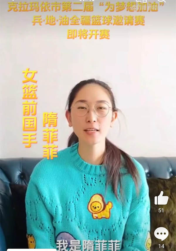 近期,在社交媒体上,隋菲菲也是录制了相关的视频为“乒.地.油全疆篮球邀请赛”加油打CALL,喊话更多的球迷关注“乒.地.油全疆篮球邀请赛”的比赛,助力新疆篮球的推广。