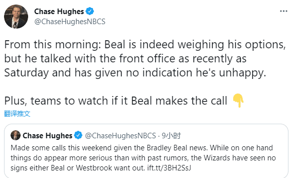 178直播讯 北京时间7月27日,究竟比尔是否会申请离队?奇才记者Chase Hughes表示球队已经和比尔沟通过,比尔没有表达不满,并且球队没有看到比尔要离队的迹象。