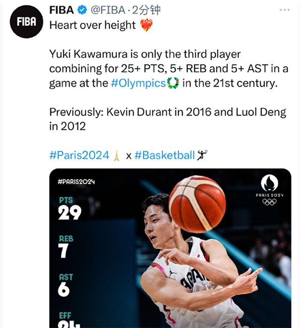 国际篮联通过官方社交媒体,点名盛赞河勇村永辉:21世纪第三位奥运会单场比赛中25+5+5的球员,在此之前是2016年杜兰特,2012年罗尔邓。