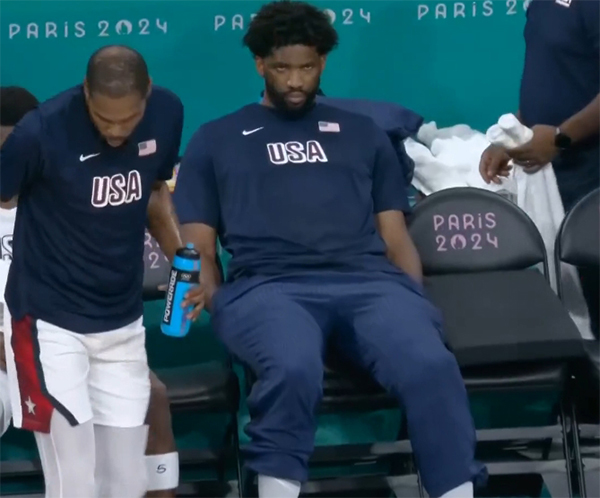 178直播讯 北京时间8月1日,奥运男篮小组赛美国男篮击败南苏丹,两战全胜排名小组第一,美国男篮主动大变阵,不仅让塔图姆浓眉首发顶替霍乐迪恩比德,而且恩比德成为美国男篮全队唯一被弃用的球员,坐在替补席双手插兜,一脸不开心的样子。
