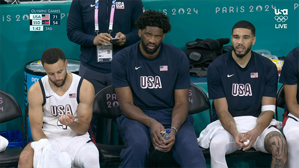 美国男篮对阵南苏丹的首发阵容是詹姆斯、库里、布克、塔图姆和浓眉,塔图姆顶替霍乐迪,浓眉顶替恩比德;小组赛首战美国队26分大胜塞尔维亚,塔图姆被DNP引发巨大争议,第二场对阵南苏丹,塔图姆首发出战获重用,但恩比德被弃用了,而且恩比德入场时惨遭法国球迷狂嘘。
