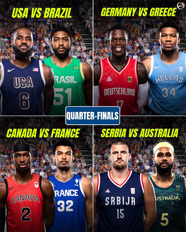 178直播讯 北京时间8月4日,巴黎奥运会男篮八强出炉,美国队三战全胜且三战狂赢64分排名第一,淘汰赛对阵巴西;希腊赶上末班车将对阵世界冠军德国男篮。