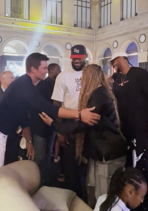 178直播讯 北京时间8月6日,美国篮协在巴黎举行50周年纪念派对,在派对现场,詹姆斯与安东尼、韦德重聚,并且与布雷迪热聊合影;库里和奥运冠军凯蒂-莱德基友好交谈。