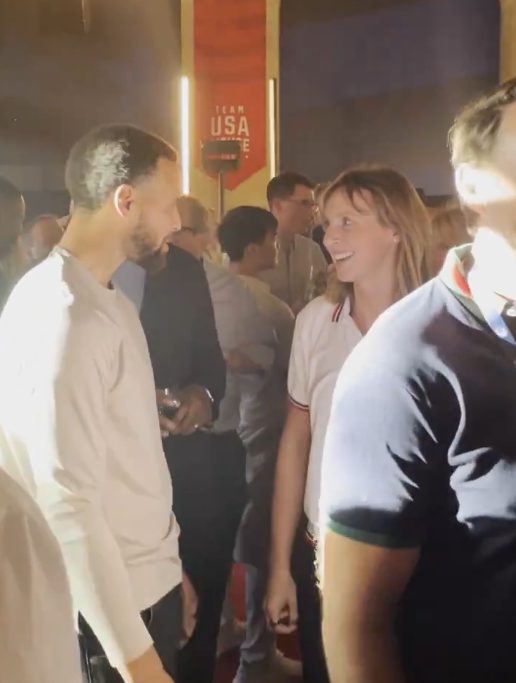 库里和凯蒂-莱德基进行了长时间的友好交流,网友调侃他们是水花兄弟和水花姐妹。