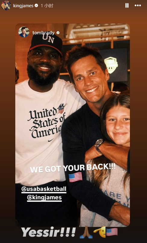 在美国篮协50周年纪念派对上,詹姆斯身穿白色T恤、戴着黑色棒球帽携妻参加活动,期间詹姆斯夫妇与美国橄榄球名宿汤姆-布雷迪热聊并且合影;布雷迪晒合影写道:我们支持你们;老詹回复:好的,收到。