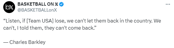 毫无疑问,美国男篮的目标只有一个,那就是奥运金牌,对此NBA名宿巴克利在节目中表示:听着,如果美国队输了金牌,我们就不能让他们回国。