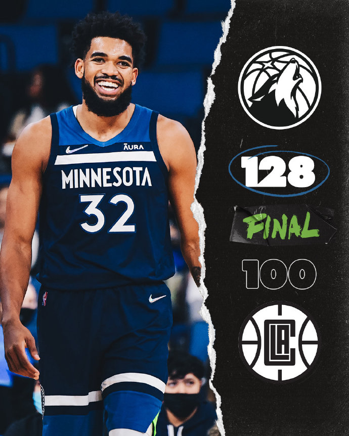森林狼:拉塞尔19分7篮板9助攻、麦克丹尼尔斯15分5篮板、唐斯17分9篮板4助攻、爱德华兹17分、诺威尔10分、里德13分、范德比尔特8分5篮板。