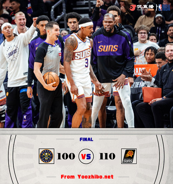 178直播12月26日讯 NBA圣诞大战,掘金对阵太阳,最近掘金发挥稳定取得2连胜,太阳遭遇3连败,布克继续缺阵。开场后太阳率先进入状态,努尔基奇不仅内线能够打进,还在外线投进一记三分,琼斯和邓恩也都状态不错,掘金先是以小波特作为主要进攻点,随后约基奇开始发力连连砍分。第二节上来比尔连续砍分带领太阳扩大优势,掘金通过内线的活跃发挥一度反超比分,小乔丹多次完成扣篮,杜兰特一记中投帮助太阳领先2分结束上半场。易边再战,掘金上来连中三分,太阳靠着比尔和杜兰特的发挥及时回应,第三节后半段掘金失误增多,戈登受伤离场,太阳建立起领先优势。最后一节掘金进攻打得十分混乱,太阳将分差拉大到两位数,最终太阳110-100复仇掘金结束3连败。