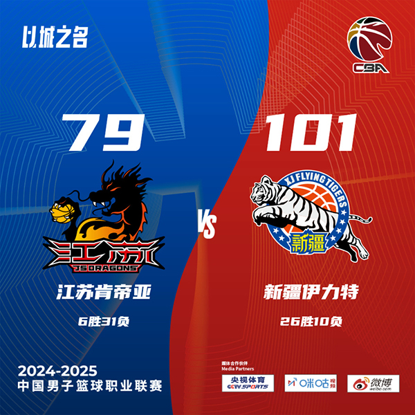 178直播讯北京时间3月8日讯 CBA常规赛,江苏主场迎战新疆,江苏目前2连败后6胜30负排在第19位,新疆则是25胜10负排在第8位。比赛开始,崔晓龙接连三分打得很主动,但赵睿里突外投连砍9分带队回应11-0直接建立主动权,杰克逊接连止血,但新疆给出回应首节领先到16分,次节江苏进攻端停滞,新疆发力13-3直接拉开20分以上领先,随后江苏接连失误被新疆打成反击,半场新疆领先到31分。下半场,新疆进攻端有些松懈,江苏两位外援带队追分,但赵睿接连突破稳住局势,新疆重新稳住近30分领先,末节双方命中率都有下降,但新疆还是掌握住20分以上领先,随后双方练兵,最终新疆101-79大胜江苏。