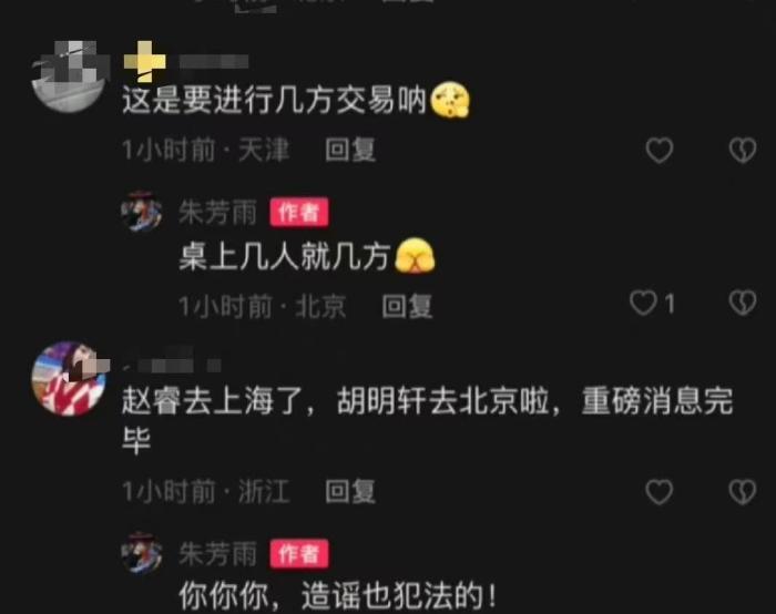 近期,网络上也是传出了上海男篮5000万+球员交易赵睿的传闻,也因为如此,有球迷在社交媒体上询问朱芳雨:“赵睿去上海了,重磅消息完毕。”朱芳雨这边也是回应:“你你你,造谣也犯法的。”从朱芳雨的回应来说,赵睿的这笔交易大概率只是传言,而且朱芳雨肯出来回应,某种程度也说明,广东男篮并不打算在休赛期交易出赵睿。