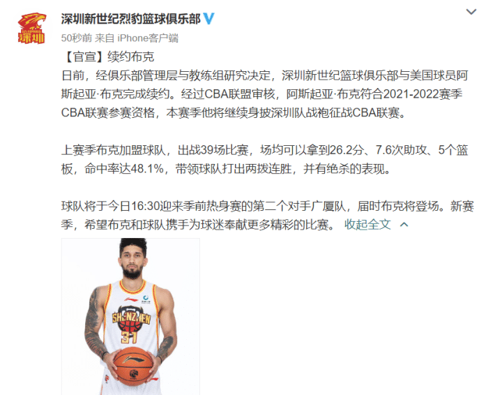 178直播10月14日讯 ,CBA深圳队官方宣布续约外援布克,新赛季布克将继续代表深圳队出战,这对球队是个很大的提升。14日季前赛,布克将首秀,为新赛季的常规赛做准备。