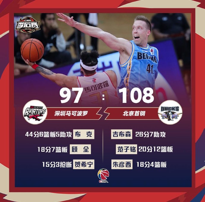 北京108-97力克深圳 范子铭20+12 吉布森26+7 布克44+6