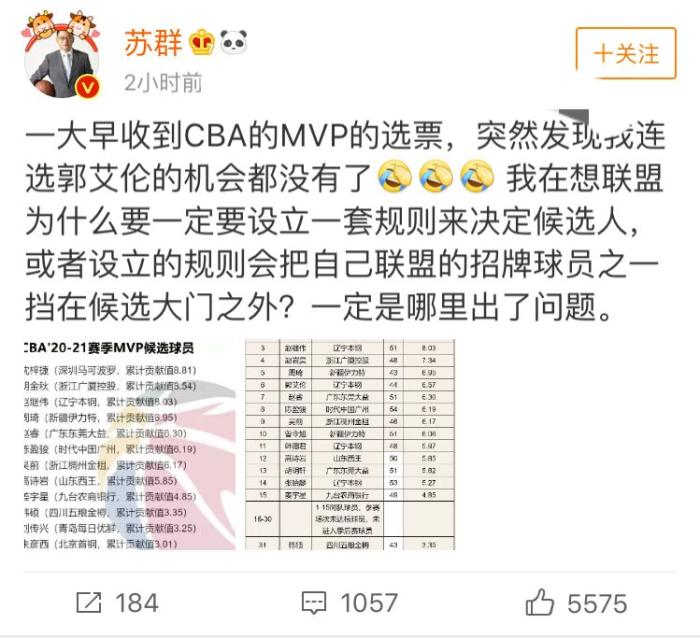 知名媒体人苏群就表明了自己对于这件事情的态度,他说自己一大早就收到了来自CBA官方的选票,可是他发现自己连选择郭艾伦的机会都没有了。他也质疑为什么联盟一定要用这样一套标准来选择常规赛MVP,难道要将自己联赛中的优秀球员拒之门外才开心吗?而苏群最后还说了一句耐人寻味的话,他认为这一定是哪里出了问题,言下之意就是CBA的管理层一定有某些神奇的操作。