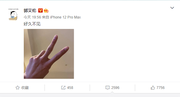 就在今天晚上,郭艾伦久违的在社交媒体上晒出,他发出了一张自己剪刀手的动作,还配文:好久不见