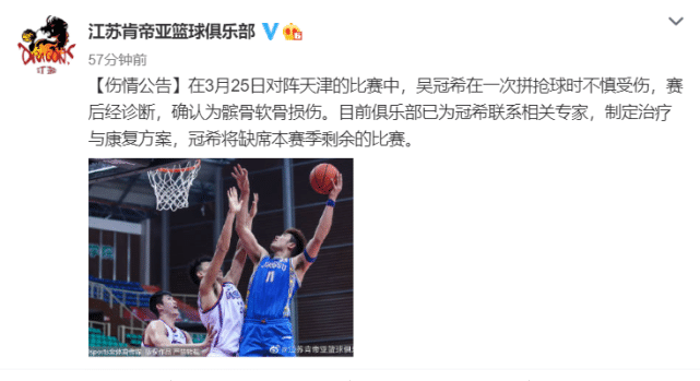 178直播讯北京时间3月28日,来自江苏男篮官方社交媒体的消息,球队主力中锋吴冠希出现,赛季报销。江苏男篮官方写道:“对阵天津的比赛中,吴冠希在一次拼抢球时不慎受伤。赛后经诊断,确认为髌骨软骨损伤。目前俱乐部已为冠希联系相关专家,制定治疗与康复方案,冠希将缺席本赛季剩余的比赛。”