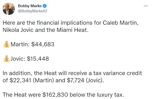 对于NBA的罚单,薪资专家Bobby Marks发推写道,马丁因被禁赛一场损失44683美元,约维奇损失15448美元;热火的税收账单总共减少30064美元。
