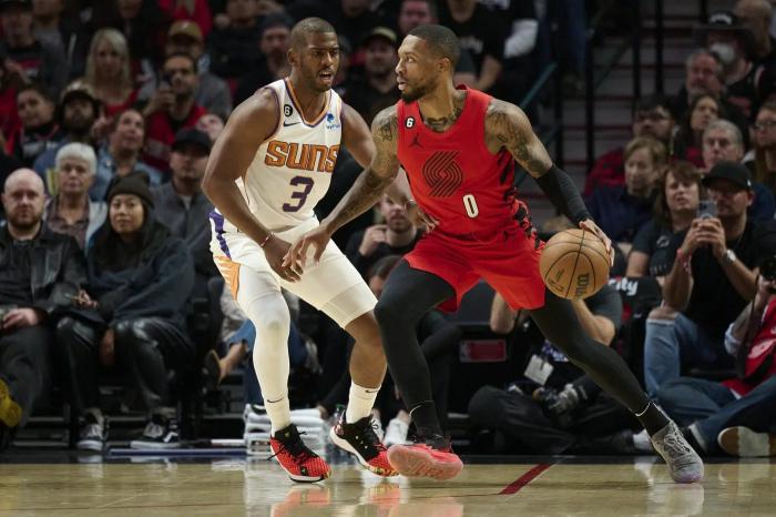 下半场,利拉德第三节拿到5分,再次投进撤步三分,开拓者继续与太阳僵持对战;末节开拓者反超扭转局面,利拉德突破上篮。