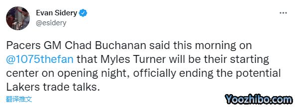 178直播09月22日迈尔斯-特纳已经确定留守步行者,据NBA记者Evan Sidery报道,步行者总经理Chad Buchanan在节目中表示,特纳将在新赛季揭幕战继续担任球队的首发中锋,正式结束与湖人之间的潜在交易谈判。