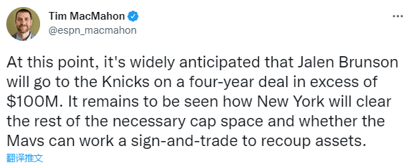 178直播讯 北京时间6月29日,东契奇的冲冠帮手布伦森可能离队,据名记Tim MacMahon报道,预计尼克斯将给布伦森一份4年超1亿美元的大合同,联盟内部人士普遍认为布伦森会加盟尼克斯而不是留在独行侠;尼克斯不仅给大合同,还承诺首发控卫,正清理薪资空间疯抢布伦森。