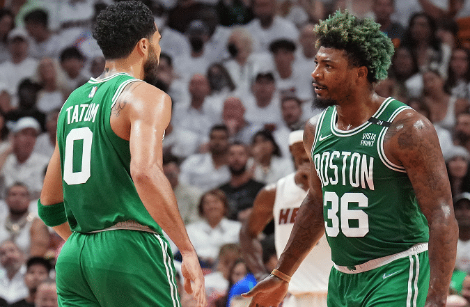 178直播05月20日讯 今天NBA季后赛东部决赛G2结束了争夺,最终凯尔特人客场取得了一场25分的大胜,系列赛大比分来到1-1平。斯玛特和霍福德归来之后效果立竿见影,尤其是砍下24分9篮板12助攻3抢断的斯玛特,不愧是本赛季常规赛最佳防守球员,他在攻防两端都贡献了超神的表现。双探花组合布朗和塔图姆合砍51分,两人手感都不错。热火的塔克遗憾伤退,巴特勒空砍29分6篮板3助攻的数据。