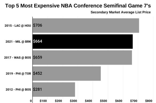 排名第二的就是篮网和雄鹿的这场抢七大战。位列第三的是2017年奇才和凯尔特人的抢七,平均票价659美元,第四的是2019年费城和猛龙的抢七,平均票价452美元,第五是2012年费城和凯尔特人的抢七,平均票价281美元。