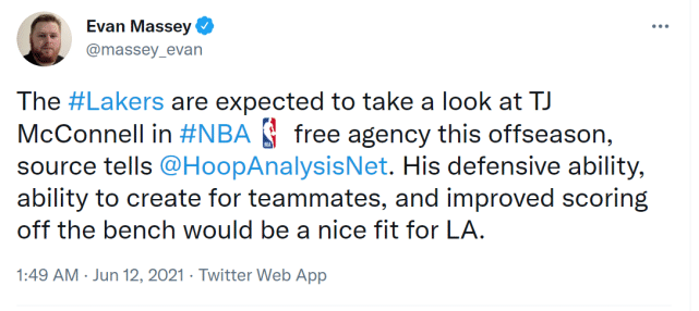 Massey报道称,麦康奈尔的防守能力、为队友创造机会的能力,以及有所提升的得分能力都将非常适合湖人的体系。本赛季,麦康奈尔打了69场常规赛,场均出战26分钟,能贡献8.6分3.7篮板6.6助攻1.9抢断,投篮命中率55.9%,三分命中率31.3%。
