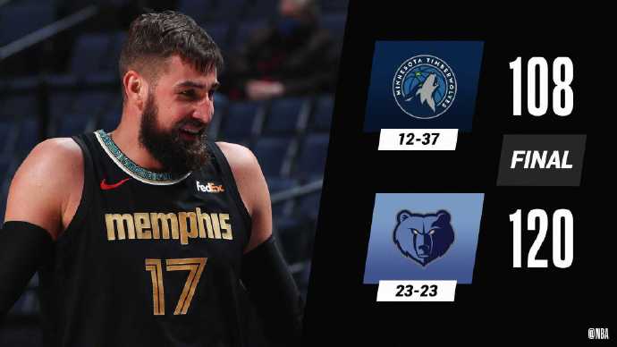 178直播4月2日讯 灰熊坐镇主场迎战森林狼,目前灰熊排名西部第10,距离第8的马刺还有1.5个胜场,森林狼是他们冲击季后赛道路上必须拿下的对手,此役卢比奥因伤缺阵。首节两队开局势均力敌,森林狼虽然打出8-0的小高潮,但灰熊靠着替补球员给力的发挥还是将比分反超,次节灰熊一波15-3将分差扩大到两位数,然而顽强的森林狼却用一阵三分雨将劣势抹平。下半场,森林狼一度陷入4分多钟的得分荒,好在他们抓住瓦兰丘纳斯4犯下场之际打出15-5的攻击波完成反超,但灰熊却在末节多点开花打出23-6的攻击狂潮将分差拉大到20分以上,森林狼后继乏力未能顶住对手的猛攻,最终灰熊主场120-108击败森林狼,距离西部第8只有一步之遥。