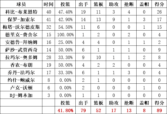 科比全场19投9中,砍下26分外另有11篮板4抢断3助攻;加索尔14投6中送出17分13篮板9助攻,另有3封盖;阿泰斯特15分,奥多姆8分10篮板。雷-阿伦得到凯尔特人最高分19分,皮尔斯、加内特分别为13分和12分,朗多15投5中数据为10分6助攻5篮板。