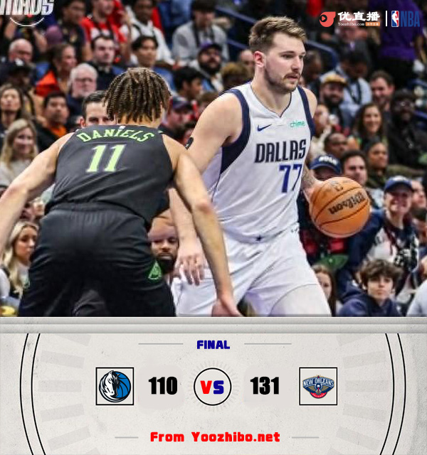 178直播11月15日讯 NBA常规赛独行侠客场挑战鹈鹕,独行侠近来取得2连胜排在西部第二,鹈鹕则是遭遇一波5连败。开场后虽然独行侠抢得先机,但鹈鹕一波10-0完成反超,东契奇手感不佳并且多次出现失误,霍金斯替补登场表现惊艳连连拿分,独行侠靠哈达威的三分咬住比分。次节鹈鹕轮换阵容进攻依旧打得风生水起,赫伯特-琼斯和霍金斯状态火热,东契奇这边依旧未能找到手感,上半场鹈鹕领先16分。下半场回来东契奇稍微找回些手感,不过锡安和英格拉姆也联手拿分,鹈鹕将分差拉大到20分开外,比赛失去悬念,最终鹈鹕131-110大胜独行侠结束5连败。