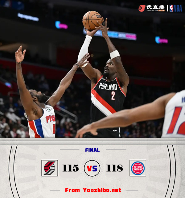 178直播讯 北京时间1月7日讯 NBA常规赛,活塞主场迎战开拓者。活塞3连胜排在东部第九,开拓者12胜22负仅西部倒数第三。上半场,开拓者率先发力,内外开花取得领先,活塞不断冲击内线连投带罚努力追赶,开拓者攻防压制对手轰出17-0的进攻高潮,分差一度拉开到20分以上,康宁汉姆和霍兰联手带队努力追赶,半场战罢开拓者60-51领先活塞。下半场,活塞占得先机打出12-2反超比分,此后双方陷入缠斗,比分始终紧咬,丰泰基奥打成3+1,末节双方争夺陷入白热化,关键时刻活塞打出10-4的攻击波确立优势,开拓者苦苦追赶无果。最终,活塞118-115逆转开拓者,取得4连胜。