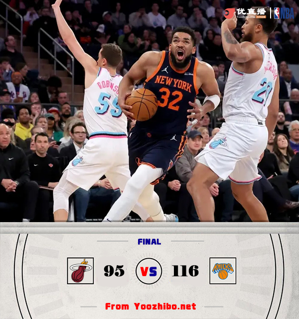 178直播讯北京时间3月18日 NBA常规赛激战正酣,热火和尼克斯两支东部球队正面对话,热火目前苦吞7连败,29胜38负排在东部第9位,尼克斯42胜24负稳居东部第三。首节开打后热火反客为主,邓肯-罗伯逊里突外投率队轰出12-0开局,布里奇斯连投带罚稍稍止血,但希罗续上火力,首节结束时热火确立11分优势,次节回来,唐斯突然爆发单节贡献15分,尼克斯一波15-2一度反超,末段两队你来我往陷入僵持,半场战罢,热火依然领先2分。易边再战后热火进攻再度停滞单节仅得到15分,尼克斯顺势反超扩大优势,三节结束后尼克斯已经领先24分,末节上来,热火无法打出追分高潮,比赛提前失去悬念,最终尼克斯116-95大胜送热火8连