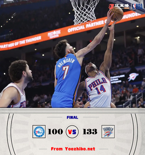 178直播3月20日讯 NBA常规赛激战正酣,西部第一雷霆主场迎战76人,亚历山大继续轮休,杰伊朗-威廉姆斯和多特继续因伤缺阵,雷霆目前56胜12负领跑西部,76人23胜45负排在东部第12位。首节开打后雷霆早早发力轰出10-0开局,格莱姆斯联手奥基基短暂止血,但雷霆多点开花牢牢占优,首节结束时雷霆已经领先16分,次节回来,雷霆进攻火力稍稍放缓,格莱姆斯连投带罚继续取分,但76人无法打出追分高潮,半场战罢,雷霆依然领先14分。易边再战后雷霆找回节奏不断扩大优势,双方分差越拉越大,三节结束后雷霆领先29分,末节上来,比赛提前失去悬念,两队陆续换上替补阵容,最终雷霆133-100大胜对手锁定西北区冠军。