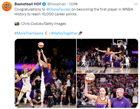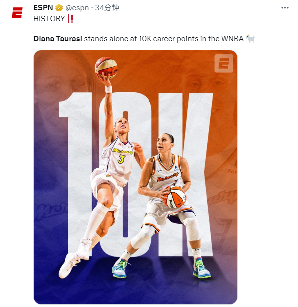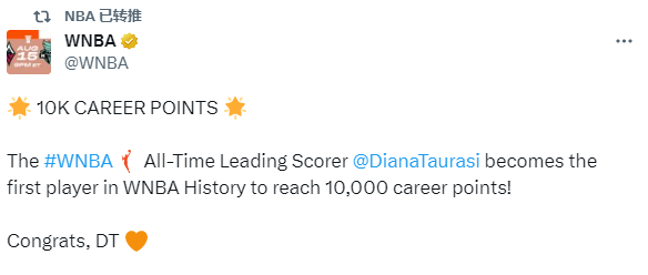 WNBA第一时间祝贺陶乐西:职业生涯10000分,WNBA历史得分王正式成为历史第一位10000分球员;NBA官方转发,太阳官方祝贺:恭喜陶乐西,THE GOAT(历史最佳)