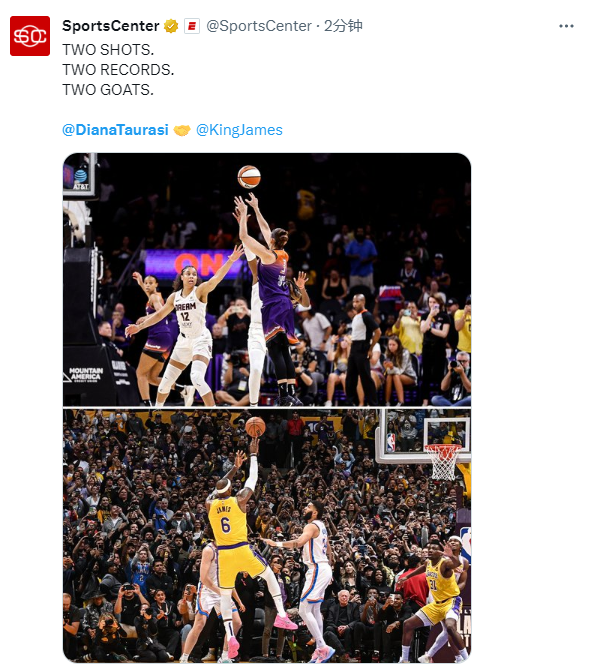 美媒纷纷晒图祝贺陶乐西拿到10000分,SportCenter把贺陶乐创纪录一幕与詹姆斯加冕历史得分王一球合在一起,写道:两个投篮,两个纪录,两个GOAT。