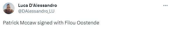 奥斯坦德首席执行官声明:作为一家俱乐部,我们非常自豪能够将这样一位优秀的篮球运动员带到这里,我们球队的稳定以及我们连续12次夺得全国冠军吸引了他,麦考是一位真正的、经验丰富的最高级别冠军,三届NBA总冠军帕特里克-麦考的到来,对我们球队是一个重大的附加值,不仅对我们俱乐部的形象,而且对我们的比赛和比利时篮球的价值都是如此。