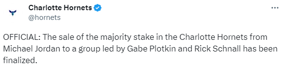 加布-普洛特金和里克-施纳尔联合声明:“我们要感谢迈克尔给我们这个机会,以及他在整个过程中的支持。在他掌控黄蜂期间,他为黄蜂队带来了稳定,实现了许多商业里程碑,重新联系并投资于夏洛特社区,使该组织取得了更大的成功。我们期待着在未来几年里在这一成功的基础上再接再厉。”