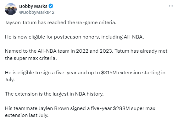 NBA薪资专家Bobby Marks报道,今天是塔图姆本赛季出战的第65场常规赛,按照联盟的规定,他已经有资格竞争今年的常规赛奖项,包括入选最佳阵容;由于在2022年和2023年都入选了最佳阵容,塔图姆已经触发了指定老将条款,无论他本赛季能否入选最佳阵容,他今年夏天都有资格续签5年3.15亿美元的超级合同,这将是NBA历史上最大的合同。