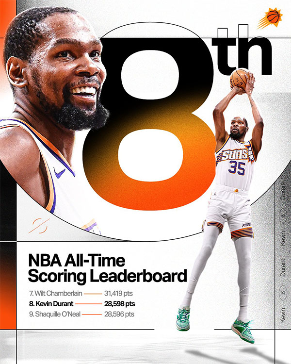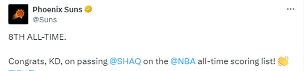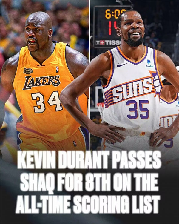 主场对阵费城76人之前,杜兰特距离超越奥尼尔仅仅只差9分,比赛正式开打后,太阳开场进攻不顺,杜兰特第一节4中2拿到4分;第二节,杜兰特再次拿到4分,半场8分,总分追平奥尼尔,下半场,杜兰特再次得分从而破纪录,太阳官方第一时间晒海报祝贺KD。