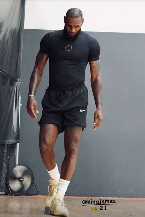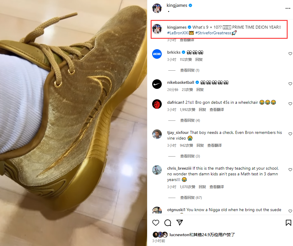 训练之余,詹姆斯还在球馆中展示他的金色版第21代战靴,配文写道:9+10等于多少?21个赛季的黄金时段。勒布朗21代战靴#追求伟大。