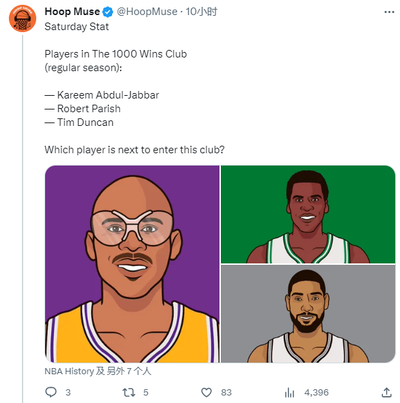 据美媒HoopMuse统计,NBA76年历史至今,史上仅仅只有三名球员进入常规赛千胜俱乐部——贾巴尔—1074胜(1560场)胜率68.8%;帕里什—1014胜(1611场)胜率62.9%;邓肯—1001胜(1392场)胜率71.9%。