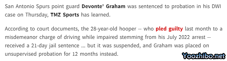 178直播讯07月31日,据美媒TMZ报道,马刺球员格拉汉姆酒驾一案已于近日宣判,被判监禁21天,缓刑12个月以及罚款393美元。
