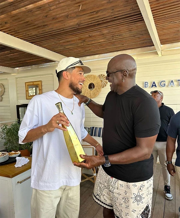 178直播讯07月30日,太阳球星德文-布克晒出他与“篮球之神”迈克尔-乔丹的合影,两人同时摸着一瓶酒并且都咧嘴大笑,很明显,他们在一起聊得很开心。