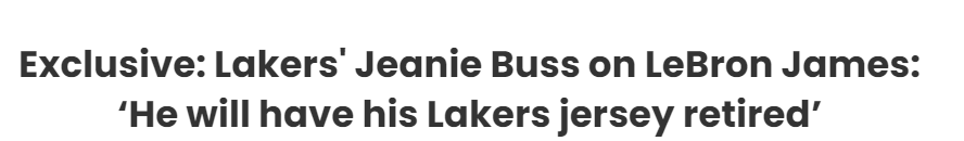 谈到是否会退役詹姆斯的湖人球衣,珍妮-巴斯表示:作为湖人球员,球衣退役的标准是进入名人堂,我毫不怀疑詹姆斯会入选名人堂,当他入选的时候,我们就会让他的球衣退役,我们都知道他会入选名人堂,也知道我们会退役他的球衣,这毫无疑问。