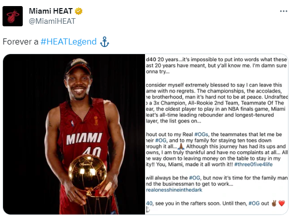 “我认为自己非常幸运,可以毫无遗憾地离开这个赛场。冠军、荣誉、兄弟情谊,伙计,很难不平静。从落选秀到三届总冠军、入选新秀第二阵容、年度最佳队友、参加NBA总决赛最年长的球员、热火队史篮板王和任职时间最长的球员,这样的荣誉不胜枚举……”