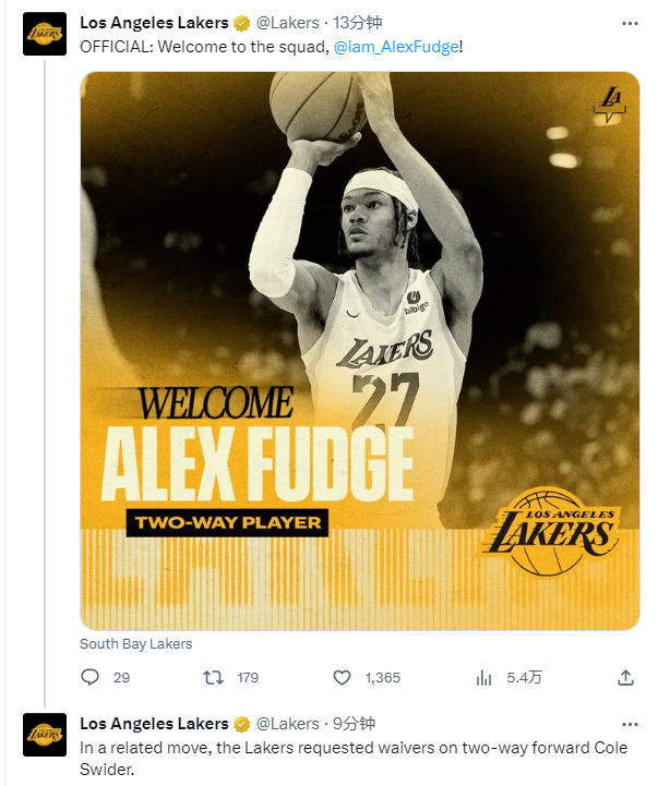 湖人官宣裁掉科尔-斯威德,并且用双向合同签下亚历克斯-福奇,佩林卡正式宣布此事,湖人官方欢迎富奇加盟。