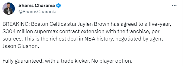 178直播讯07月26日,据名记shams报道,杰伦-布朗和凯尔特人达成一份5年3.04亿美元的提前续约合同,打破约基奇的纪录创造新的NBA历史最大合同,成为今夏也是历史上第一位拿到3亿大合同的球员;这份合同是全额保障的,并且含有交易保证金,没有球员选项。