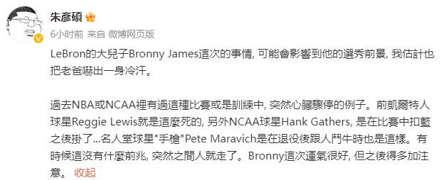 对此布朗尼的情况,媒体人朱彦硕表示:勒布朗的大儿子布朗尼的这次事情, 可能会影响到他的选秀前景,我估计也把老爸吓出一身冷汗。”