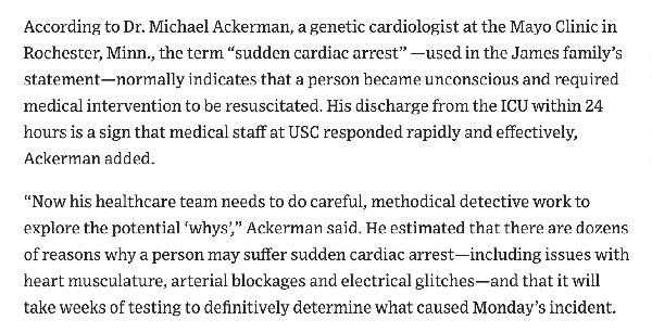 遗传心脏病专家Michhael Ackerman表示布朗尼因心脏骤停而失去意识,需要医疗干预才能复苏,他在24小时内离开重症监护室,这表明南加州大学的医学人员反应迅速且有效;现在布朗尼的医疗团队需要进行仔细、有条不紊的工作来探索潜在的原因,心脏骤停的原因很有多,这需要数周的检测才能确定最终的原因。