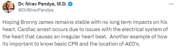 医学专家Nirav Pandya表示希望布朗尼能够保持稳定,不要对他的心脏造成长期影响。心脏骤停是由于心脏供血系统出现问题导致心律不齐而发生的。