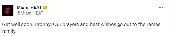 热火官推写道:布朗尼,早日康复。我们为詹姆斯的家人祈祷并致以最美好的祝愿。